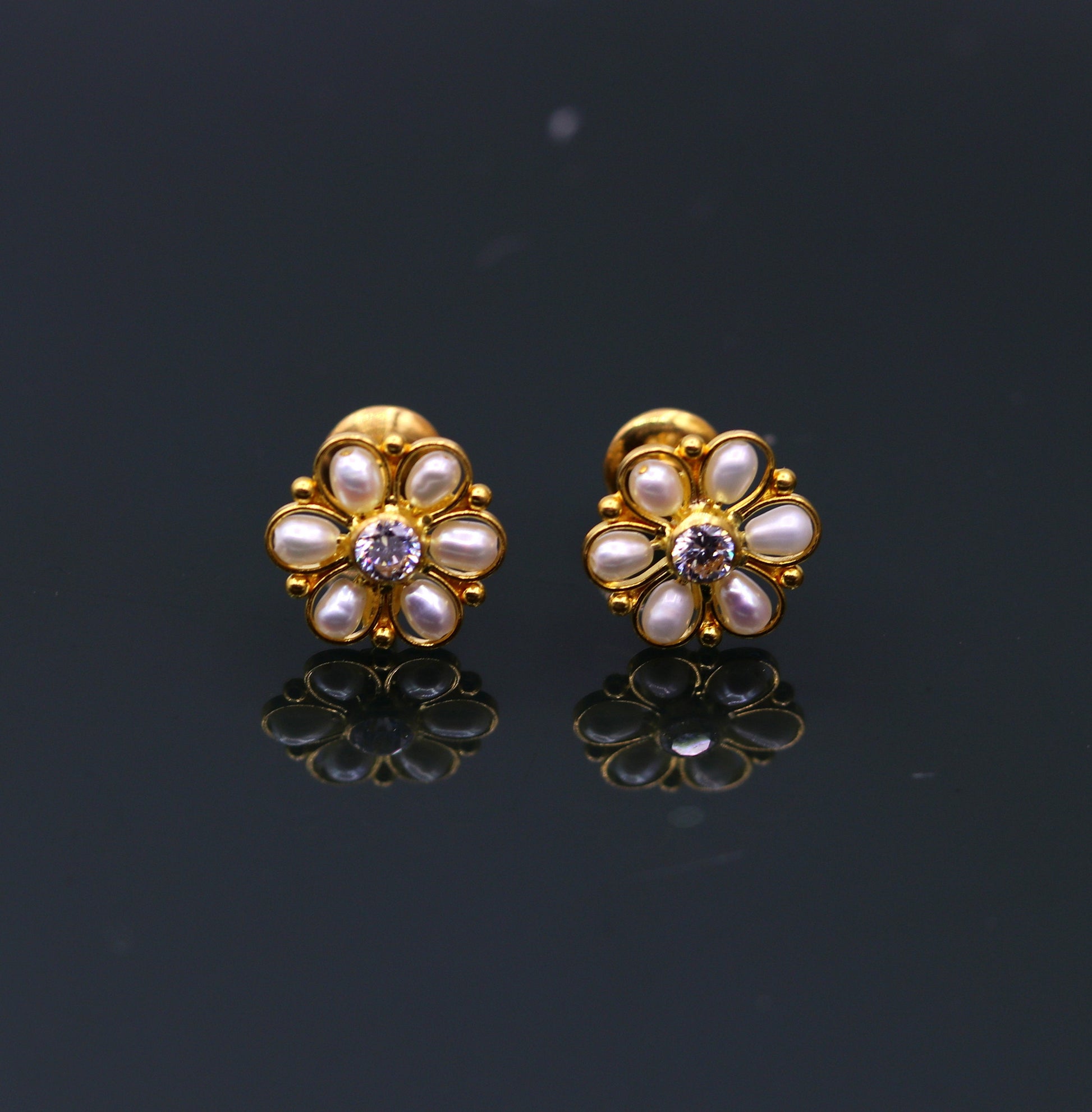 22kt yellow gold handmade stud earrings with fabulous pearl and cubic zircon earrings stylish modern girl's jewelry from india