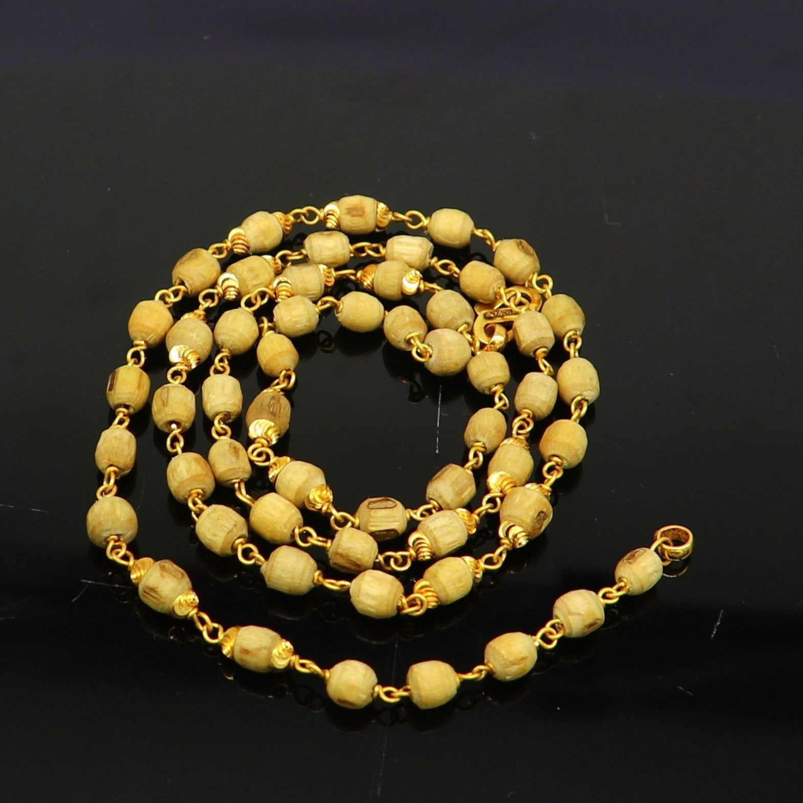 22KT Yellow Gold Handmade Tulsi Rosary Wooden Beads Chain Necklace | Customized Basil Mala | 916 Hallmarked Unisex Spiritual Gifting Jewelry | GCH005