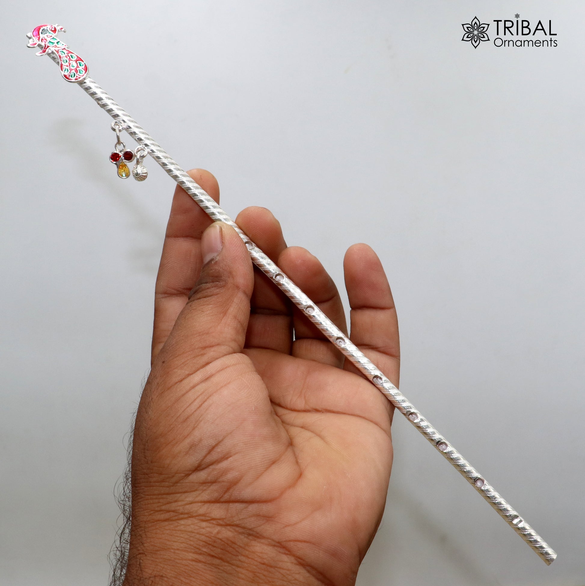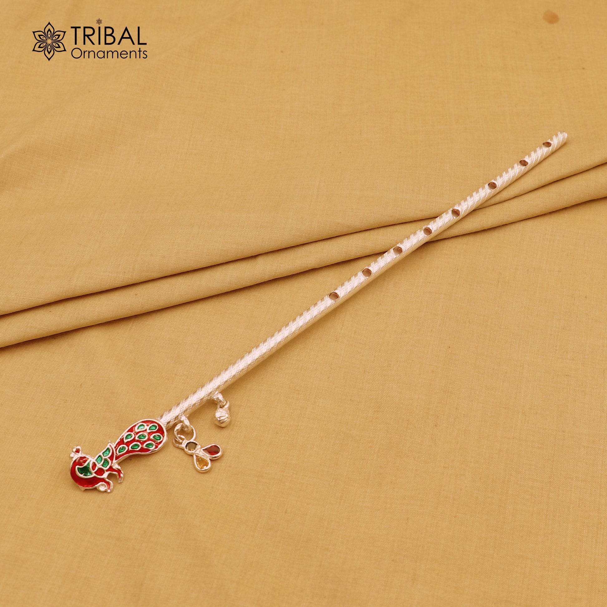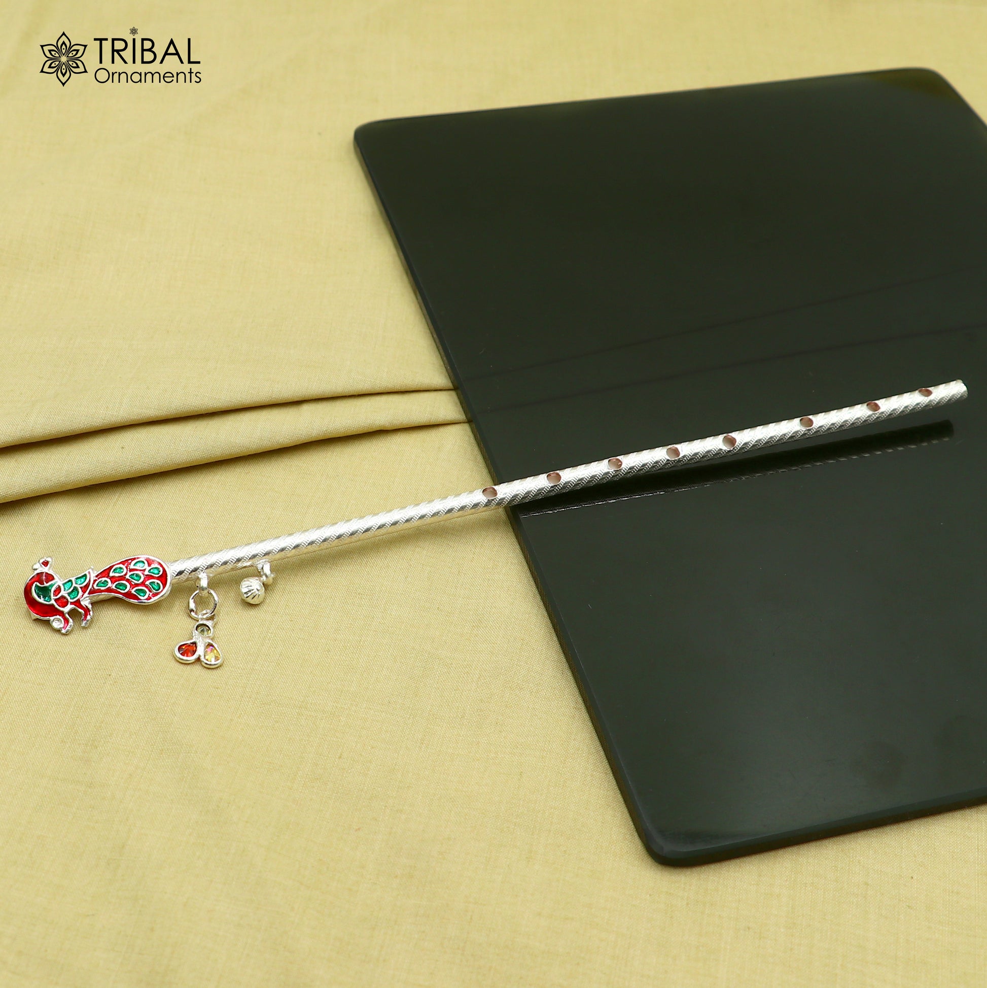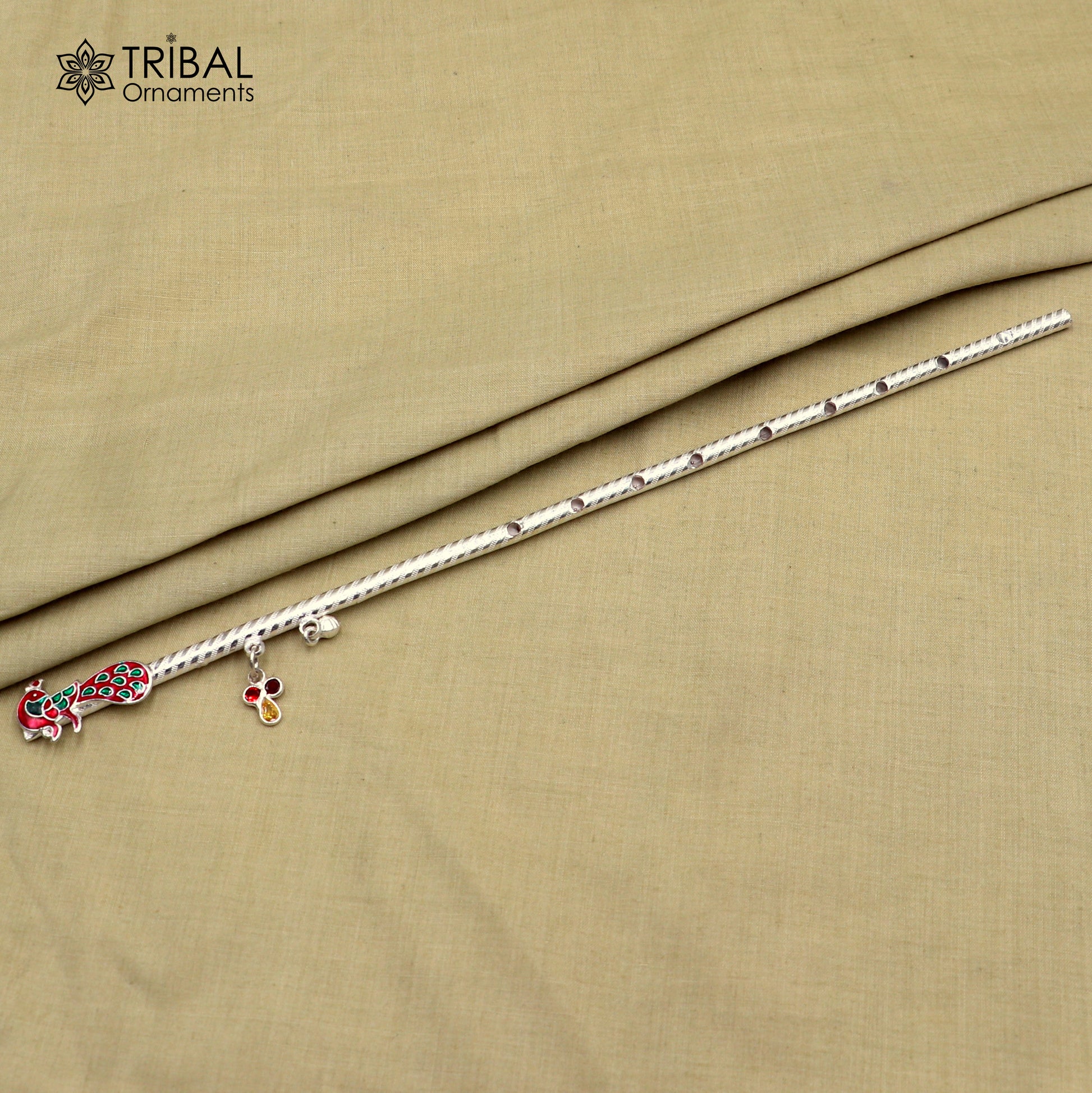 10.6" 925 sterling silver peacock design bansuri laddu Gopala flute, Krishna flute su1370