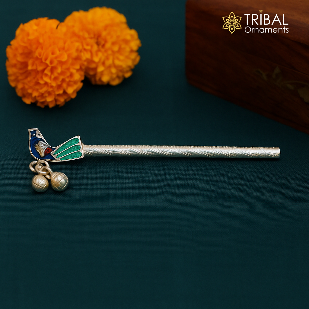 8cm 925sterling silver handmade Peacock design Krishna flute, silver Bansuri, Baby Gopala flute, little krishna flute puja art su580