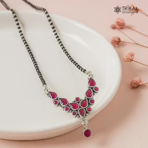 925 sterling silver black beads and red cut stone mangal sutra necklace brides Mangalsutra chunky necklace ms85