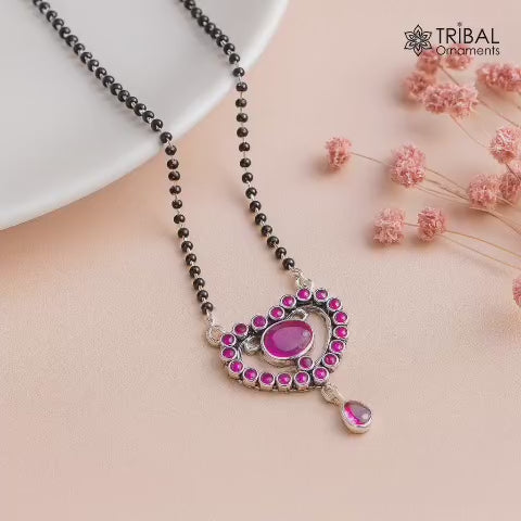 925 sterling silver black beads and red cut stone heart design mangal sutra necklace brides Mangalsutra chunky necklace ms84