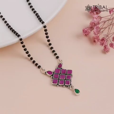 925 sterling silver black beads chain Trendy necklace, gorgeous multicolor stone pendant, traditional style brides Mangalsutra necklace MS05