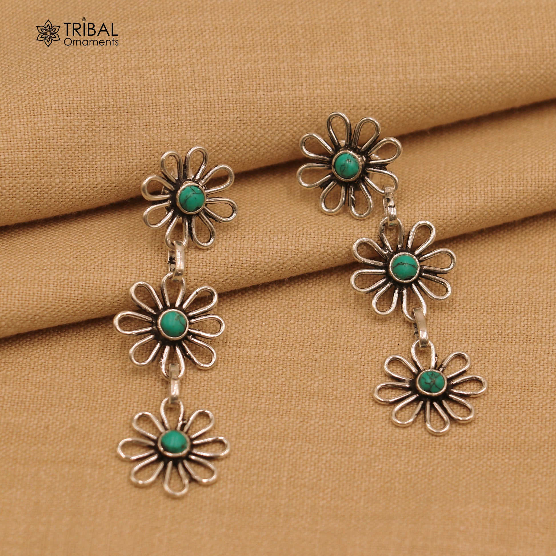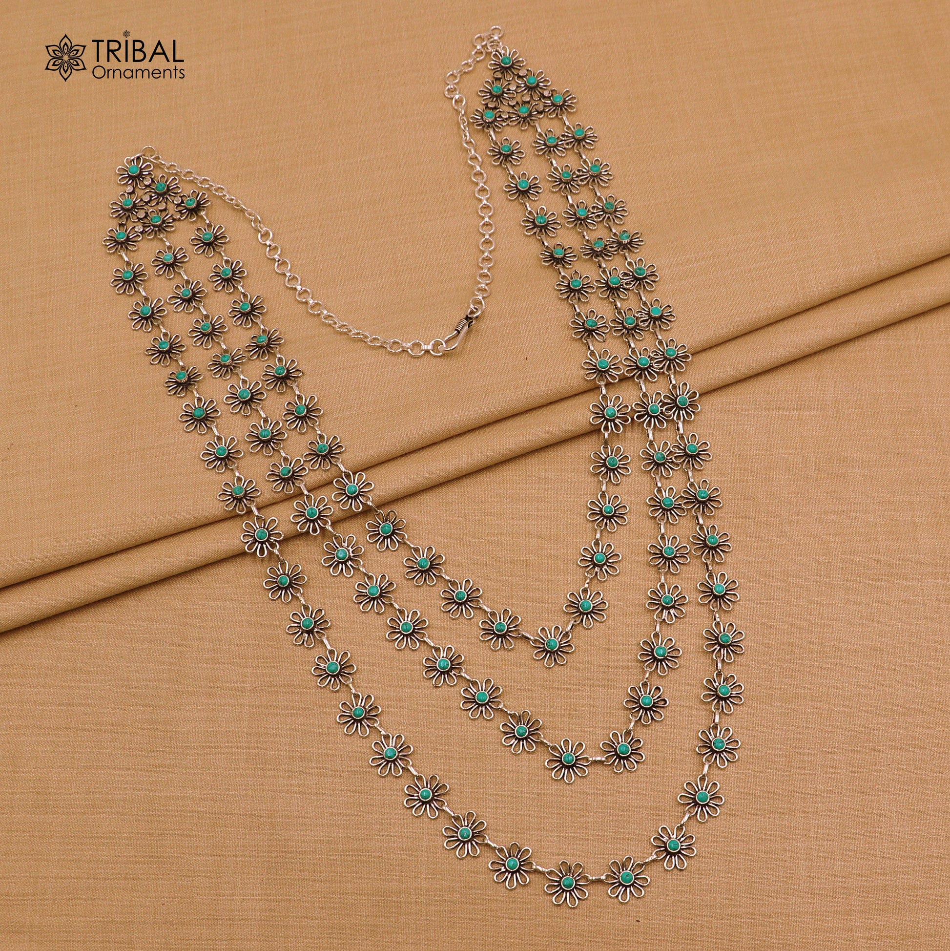 925 sterling silver floral style turquoise stone 3 line necklace set ethnic jewelry set793