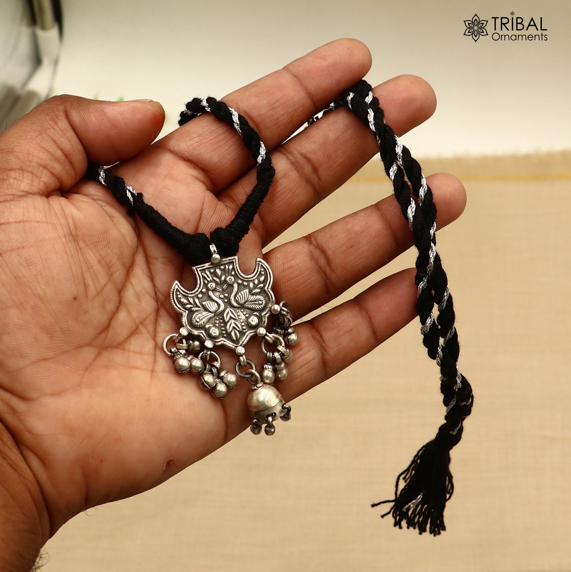 925 sterling silver chitai work drop dangle bells peacock design black thread (dori) ethnic necklace set788