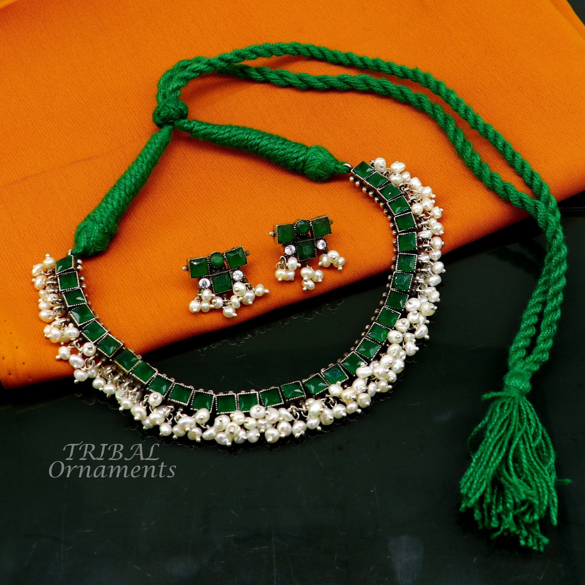 925 sterling silver customized guttapusalu necklace set amazing green stone and hanging pearl ethnic tribal brides jewelry set512