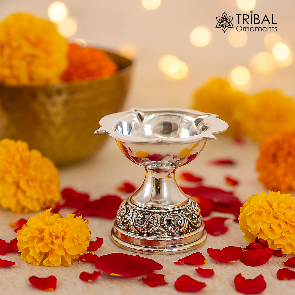 925 sterling silver handmade chitai work kandrai work design oil lamp, silver Deepak, silver temple article, puja utensils art su475
