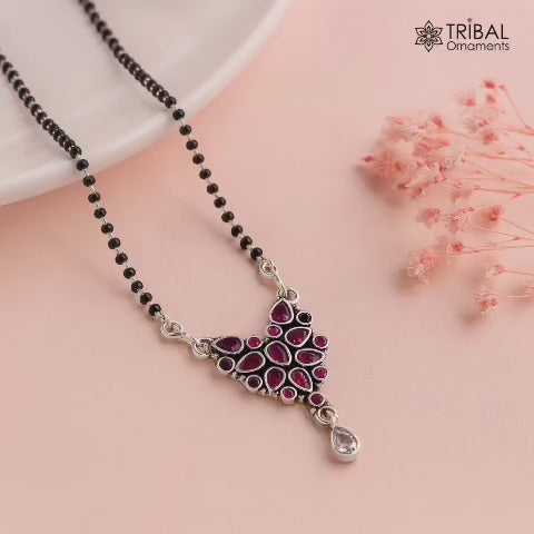 925 sterling silver handmade delicate black beaded chain and fabulous cut stone pendant, amazing brides mangalsutra necklace from india ms46