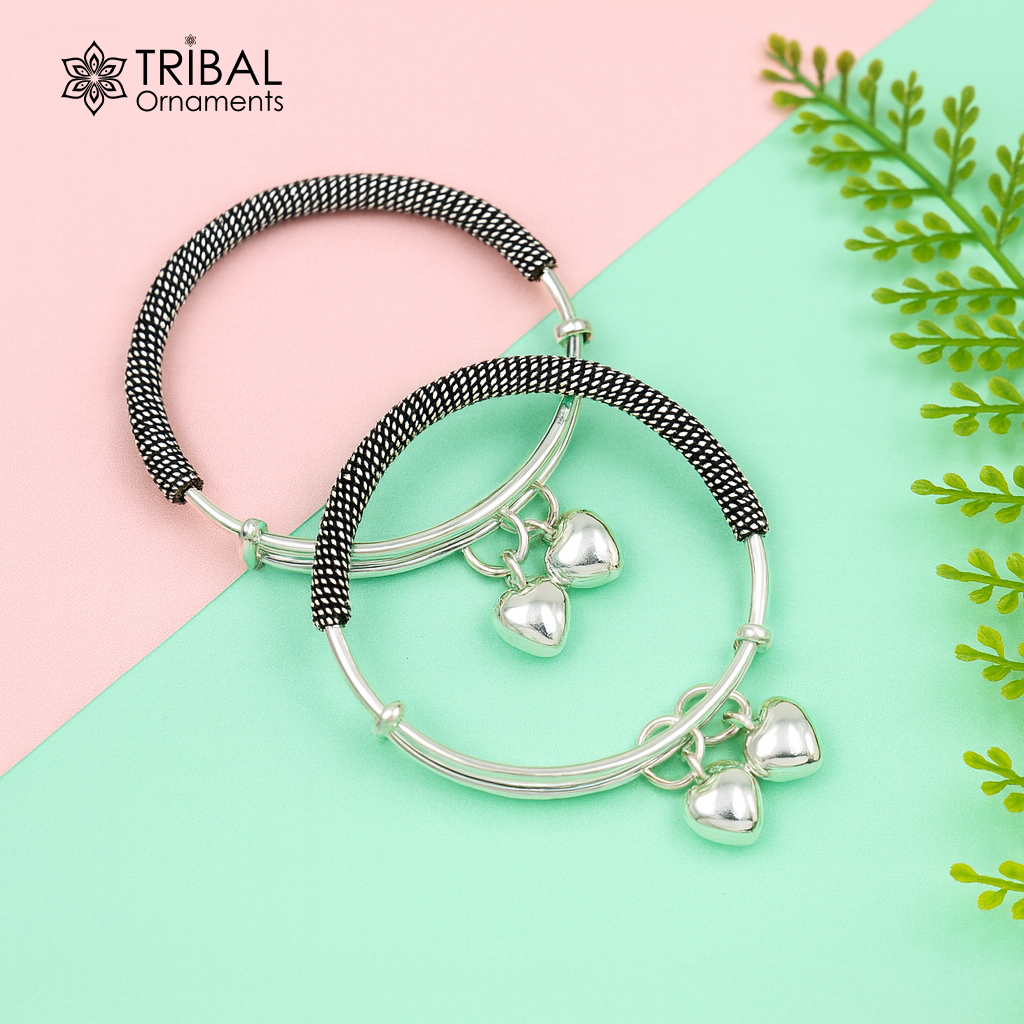 925 sterling silver handmade fancy adjustable baby bangle kada bracelet, fabulous heart shape hangings charm bangles unisex kids bbk70