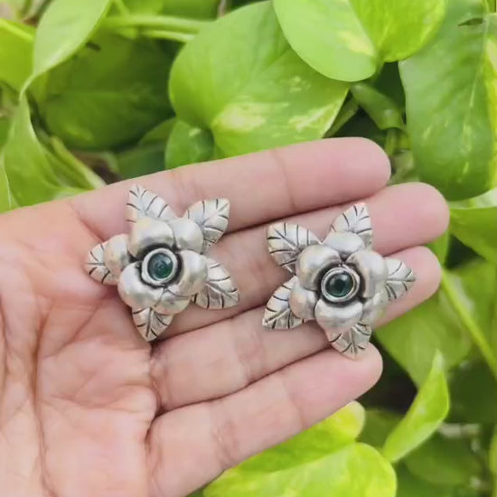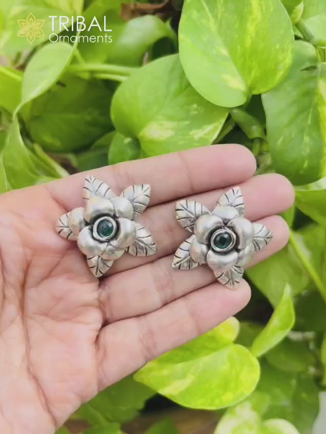 925 sterling silver handmade floral design Stud earring with green stone fancy girl's earring brides jewelry from india S1253