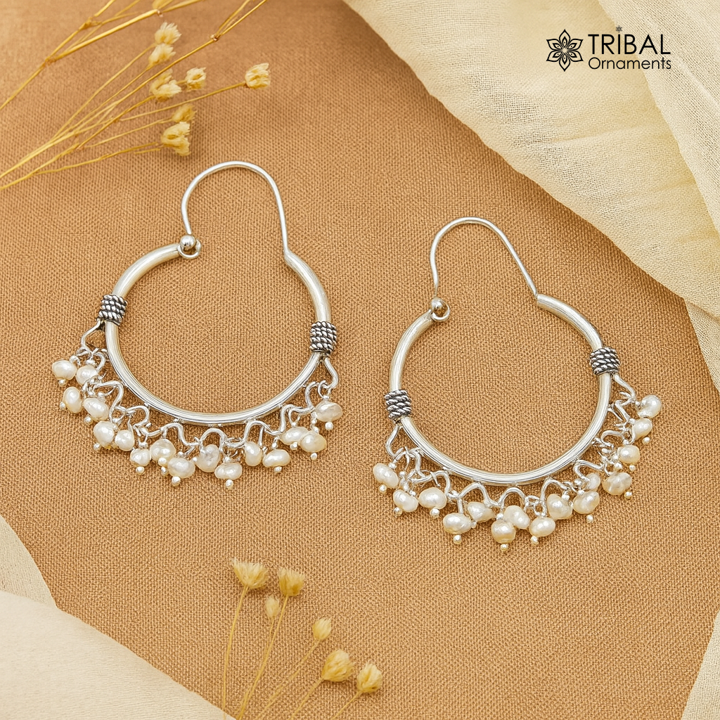 925 sterling silver handmade hoop earring, fabulous Bali, hanging pearls, hook, hoop gifting gorgeous tribal customized jewelry s1146