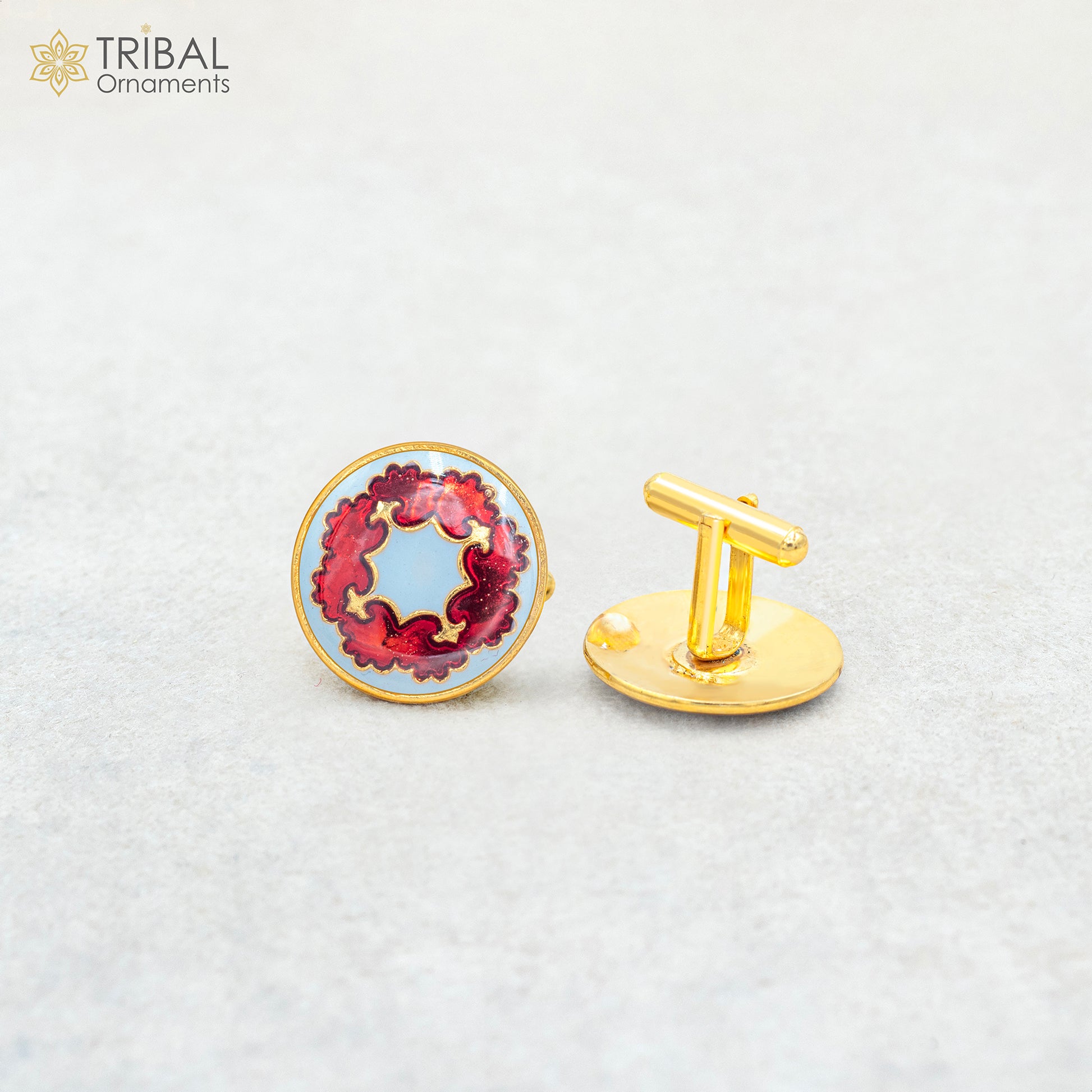 925 Sterling silver handmade stylish minakari design gold polished cufflinks set of 2 pc for men's coat or suit, best jewelry for all occasions btn109