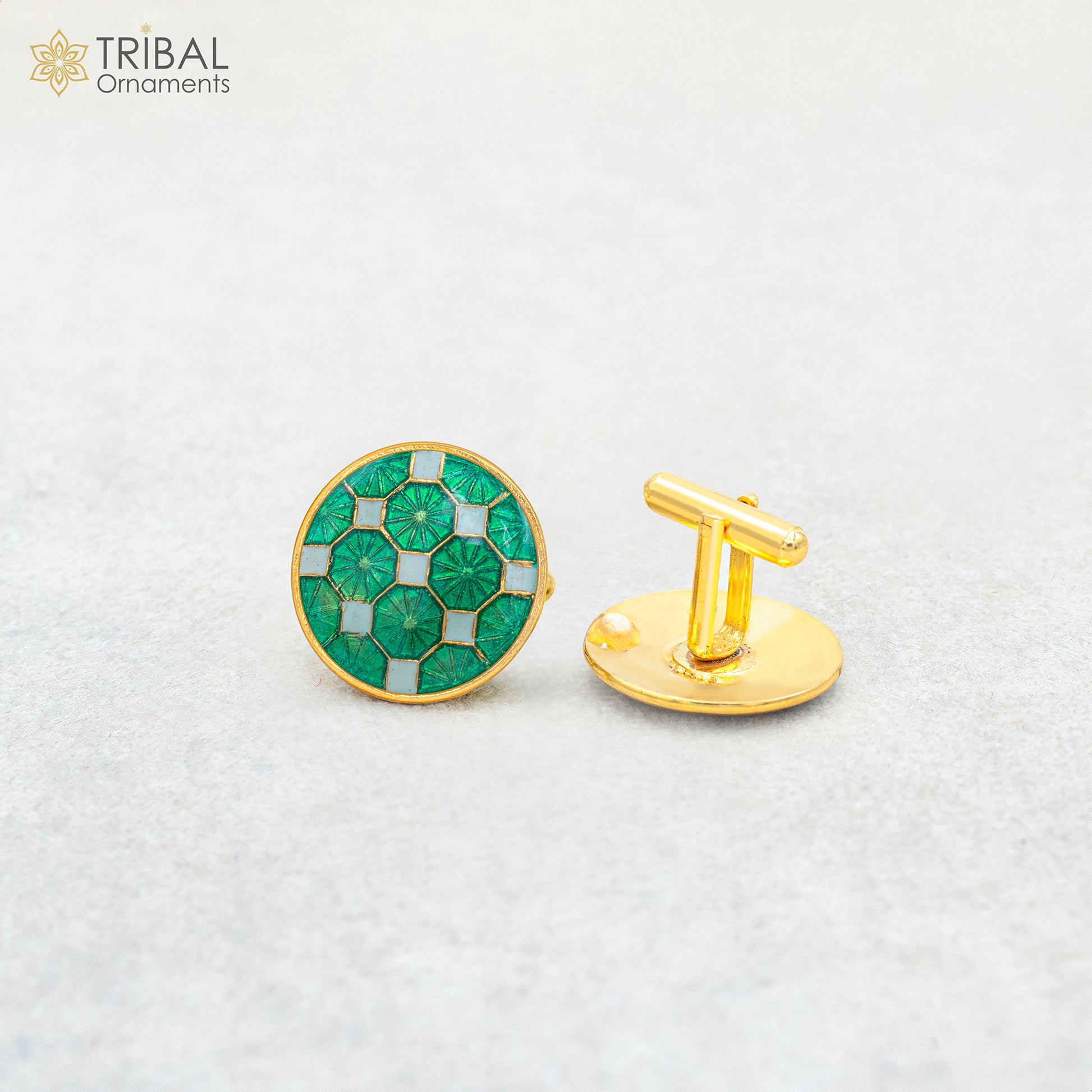 925 Sterling silver handmade stylish minakari flower design gold polished cufflinks set of 2 pc for men's coat or suit, best jewelry for all occasions btn95