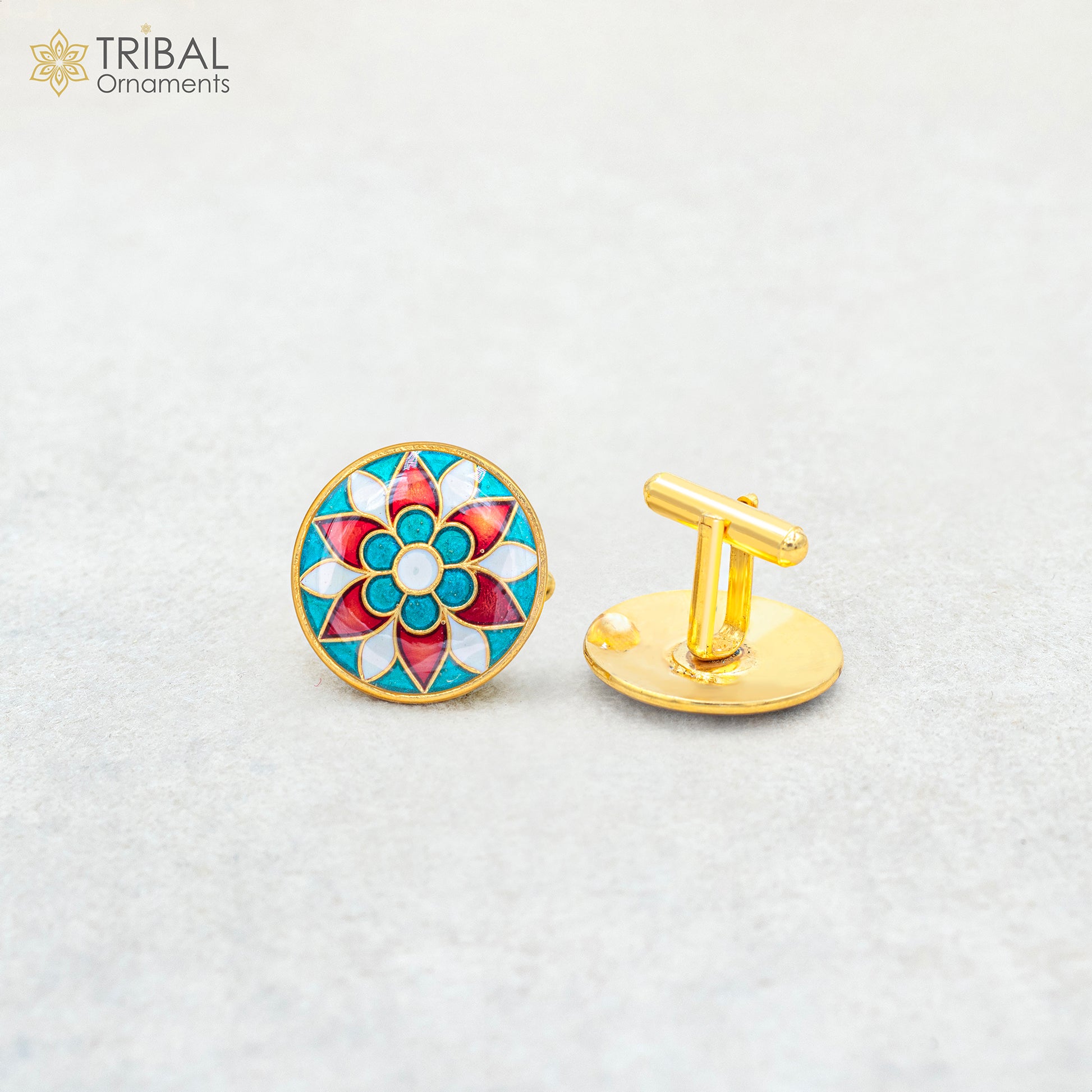 925 Sterling silver handmade stylish minakari mandala design gold polished cufflinks set of 2 pc for men's coat or suit, best jewelry for all occasions btn102