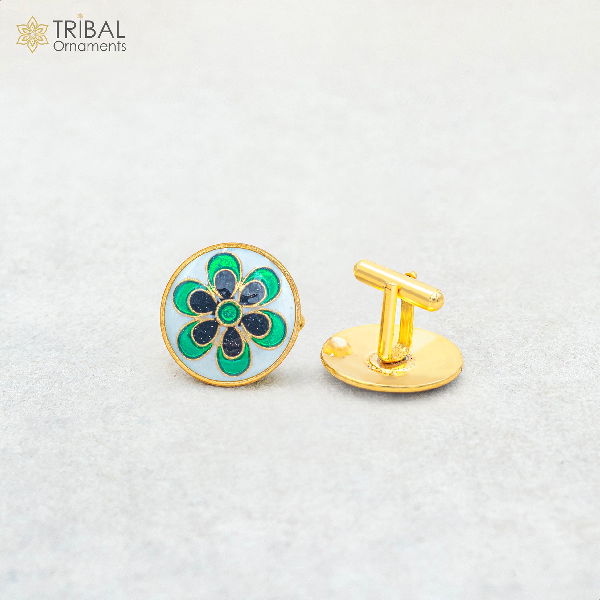 925 Sterling silver minakari flower design gold polished cufflinks set of 2 pc for men's coat or suit btn106