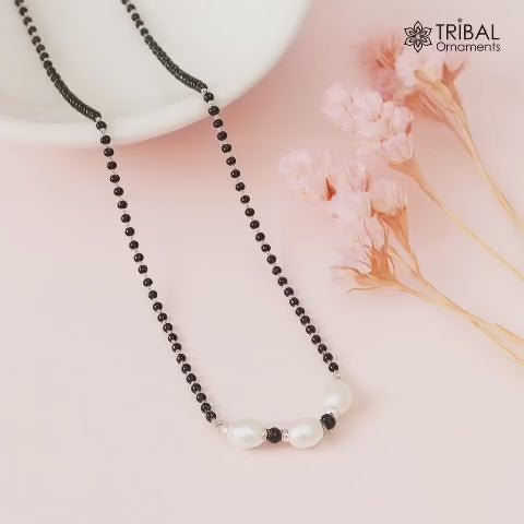Elegant 925 sterling silver black beads chain necklace, gorgeous small stone design pendant, Mangalsutra chain beaded necklace set639