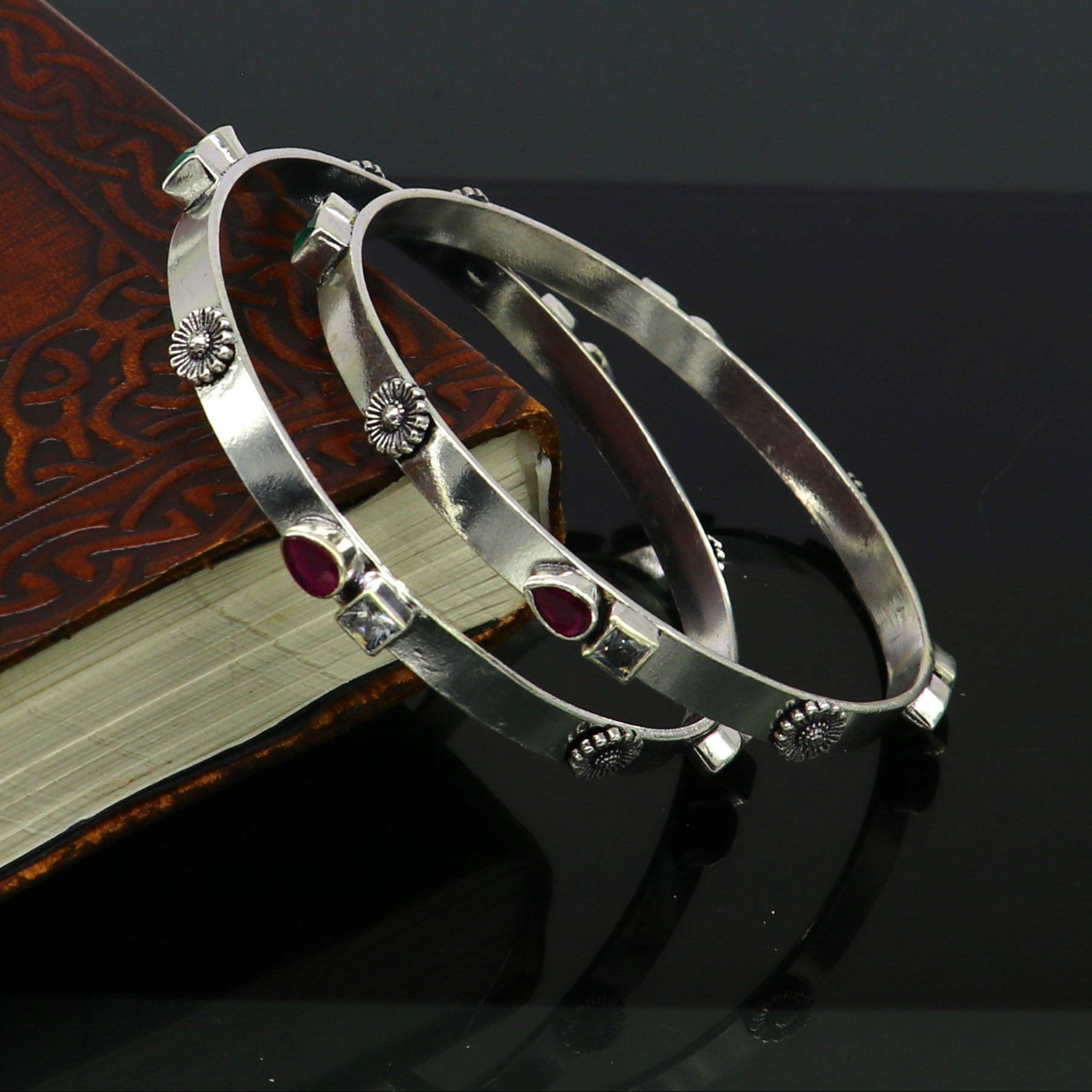 exclusive unique design handmade 925 sterling silver plain design green red stone bangles bracelet, tribal stylish fancy jewelry nba118