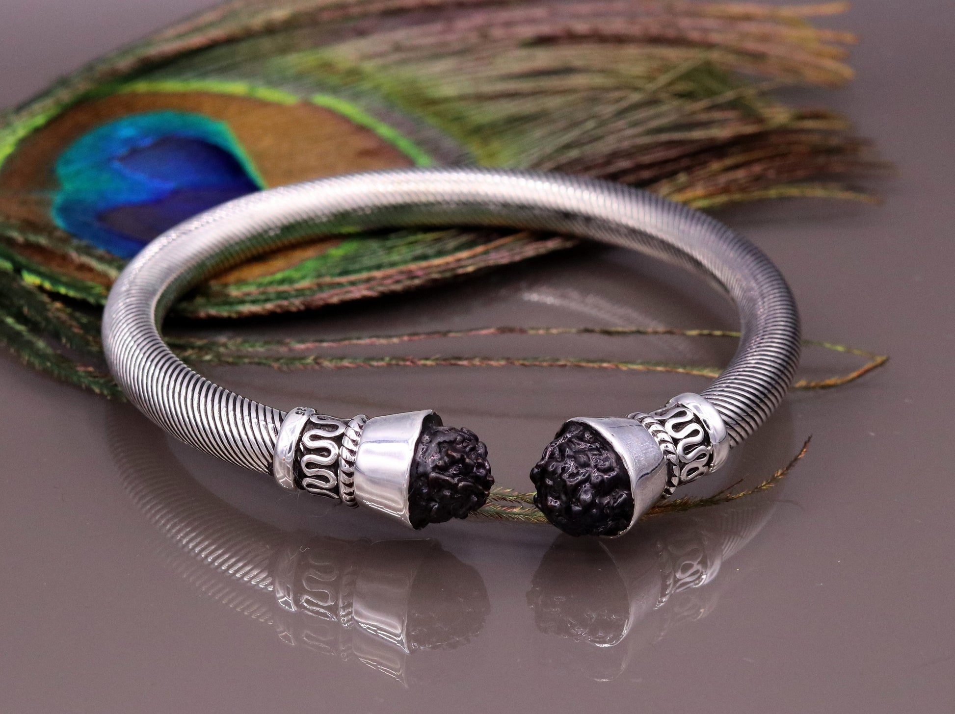 Handmade 925 sterling silver antique style bangle bracelet kada with amazing rudraksha beads open face unisex jewelry nsk57
