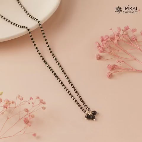 Pure 925 sterling silver beaded ball pendant and black beaded chain necklace, vintage antique style Mangalsutra ms111