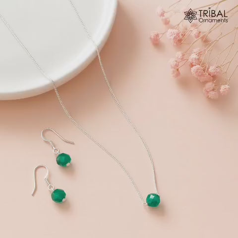 Pure 925 sterling silver chain necklace set and vintage antique green colour ball style pendant and earing set ms121