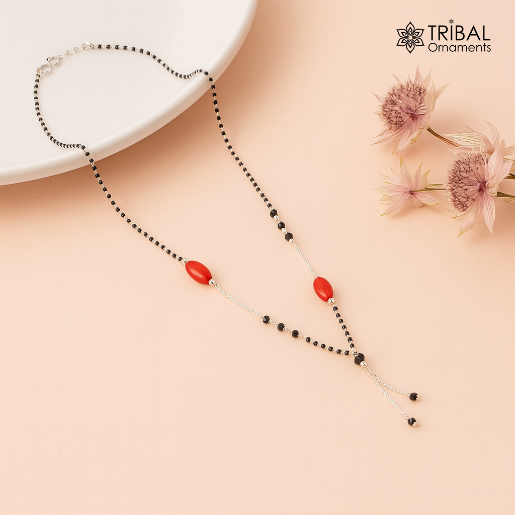 Pure 925 sterling silver pearl beaded and black beaded chain necklace, vintage antique style Mangalsutra necklace ms 108