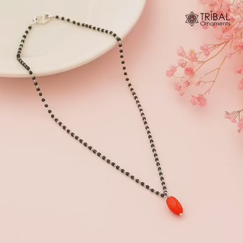 Pure 925 sterling silver red colour's beaded ball pendant and black beaded chain necklace, vintage antique style Mangalsutra necklace ms 109
