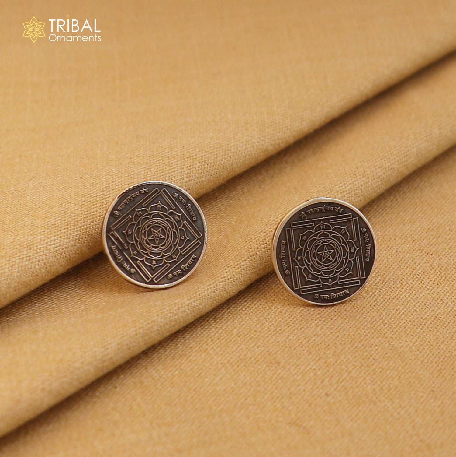 Round 925 sterling silver mahamrityunjay yantra stud earrings, unisex jewelry ear743