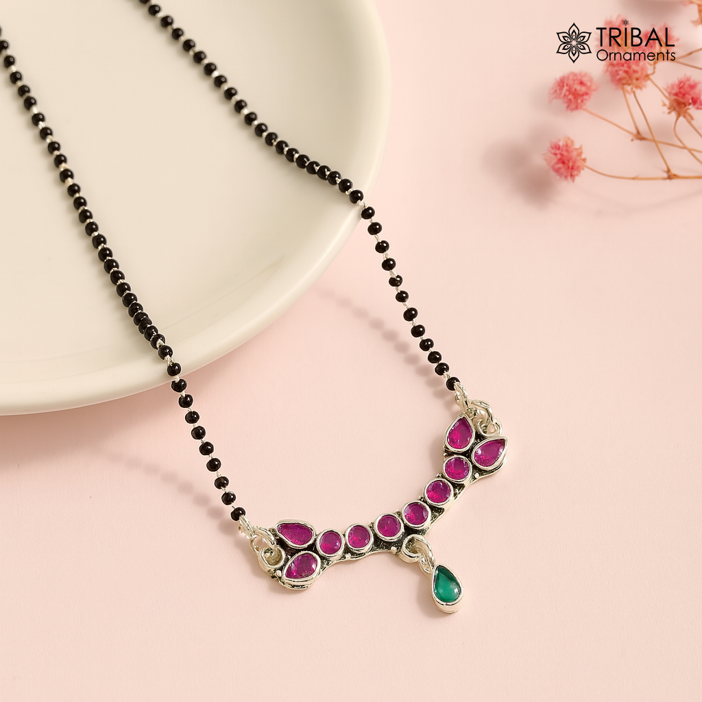 Trendy Red cut stone mangalsutra pendant 925 sterling silver black beads chain necklace, traditional style brides Mangalsutra necklace ms16